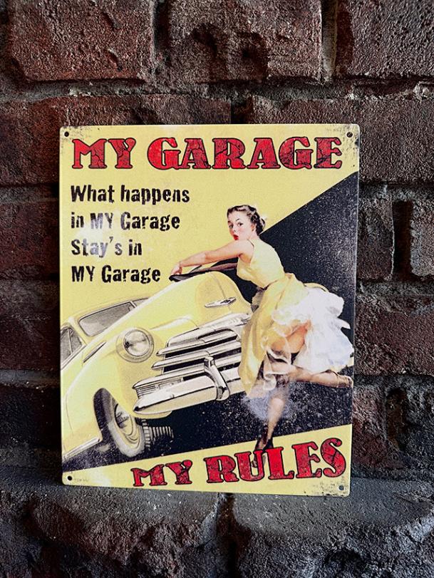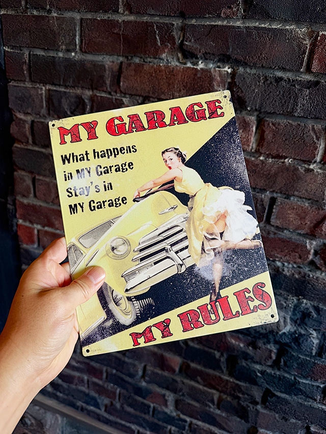 「ガレージは俺の城」 旧車&ピンナップ ミニブリキ看板